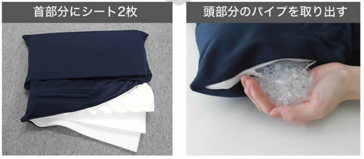 付属の2枚のウレタンシートを首に使用したり、頭部分のパイプの量を調節することで好みの高さに調節することができます。